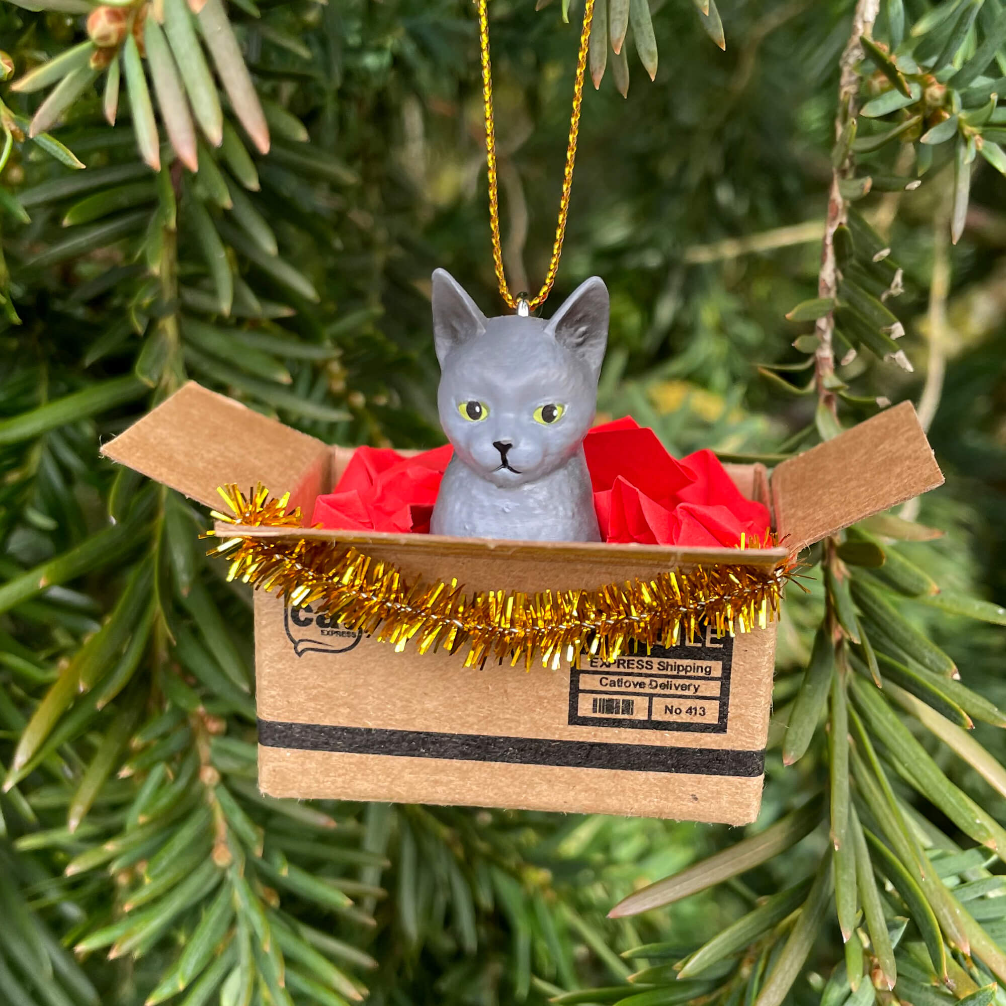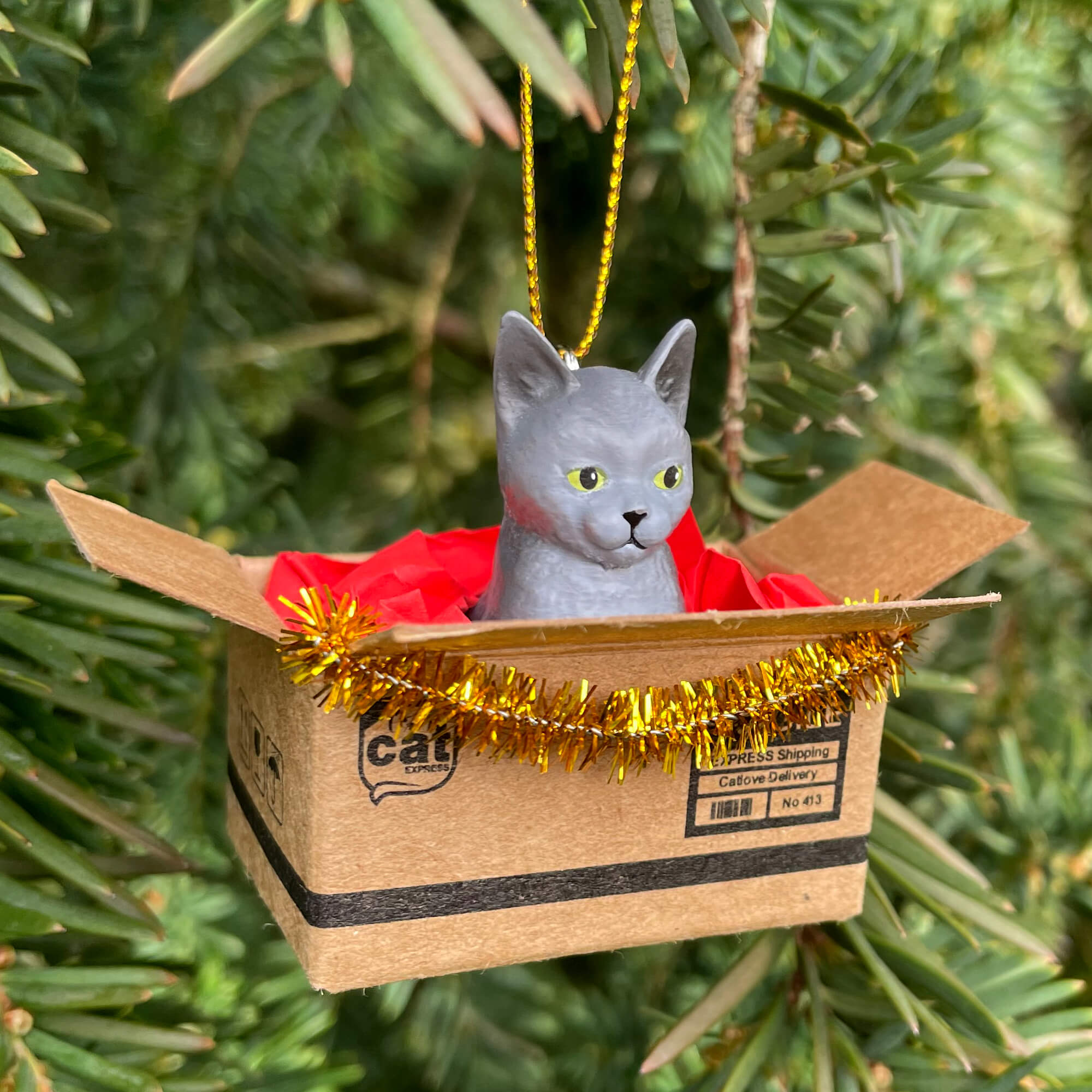 Ein ganz besonderer Weihnachtsbaumanhänger für das Fest mit deinen Lieben oder als supersüßes ausgefallenes Geschenk! Gemacht für Katzenliebhaber mit eingearbeitetem Lieblingsplatz jeder Katze: dem Karton!