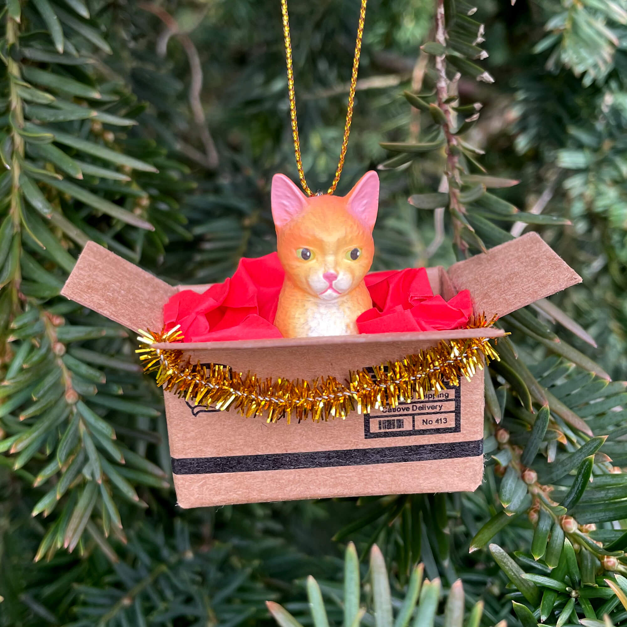 Ein ganz besonderer Weihnachtsbaumanhänger für das Fest mit deinen Lieben oder als supersüßes ausgefallenes Geschenk! Gemacht für Katzenliebhaber mit eingearbeitetem Lieblingsplatz jeder Katze: dem Karton!