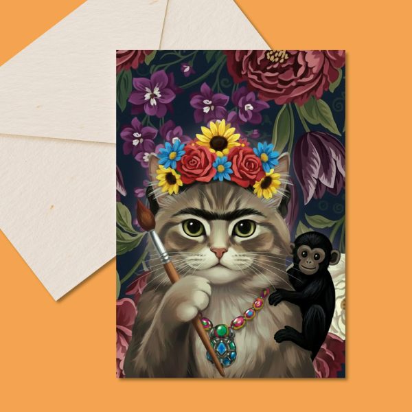 Diese süße Postkarte als Hommage an Frida Kahlo kannst du perfekt als Grußkarte oder auch als Geburtstagskarte verschenken oder aber einfach ohne Anlass für jede Katzenmama – zu unserer süßen Karte auf stabilem 300g Naturpapier erhältst du einen pinken Umschlag dazu.