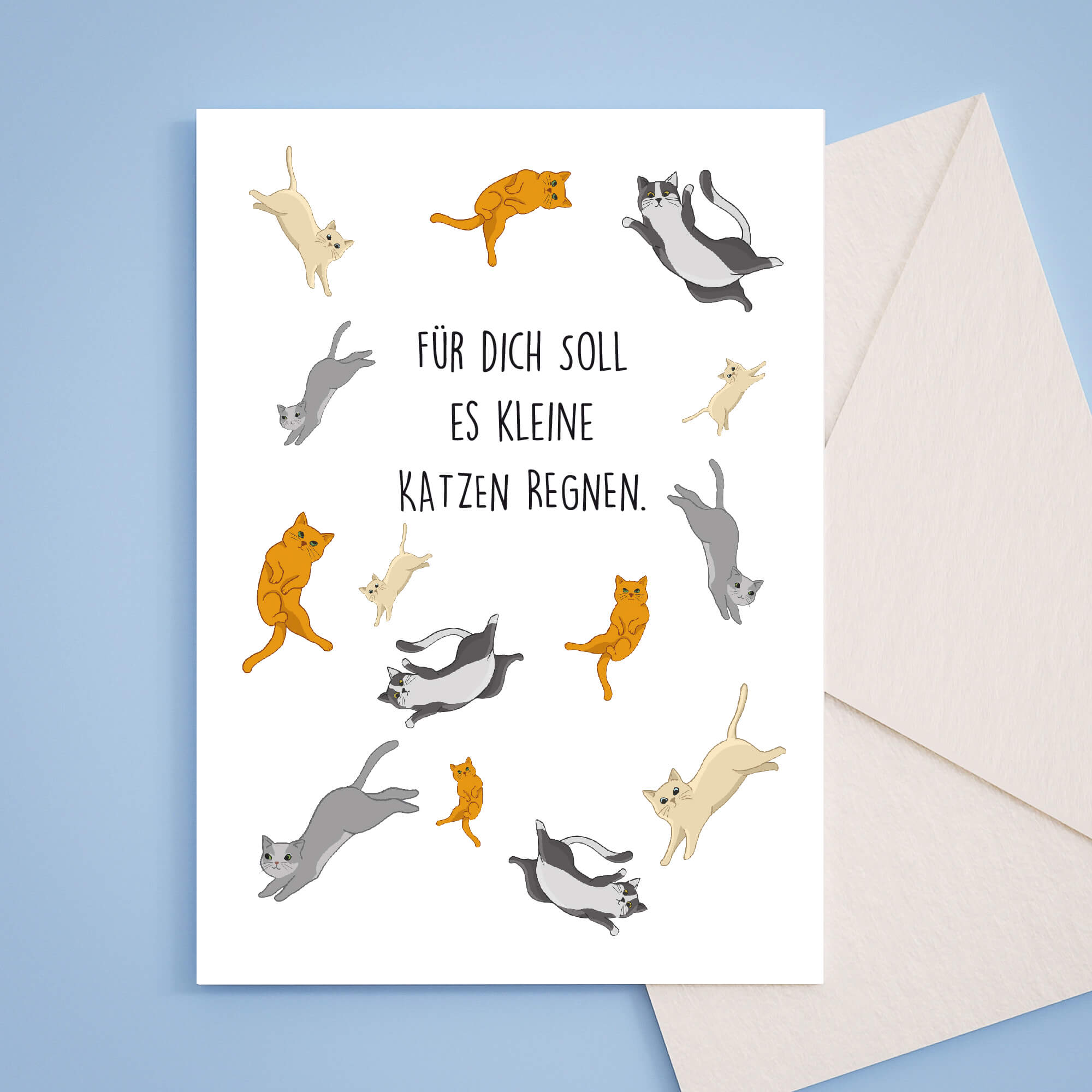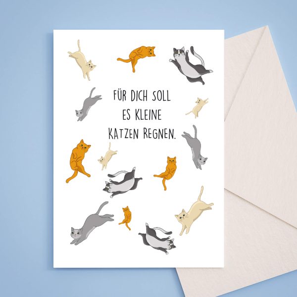 Diese niedliche Grußkarte mit regnenden Katzen ergänzt dein Geschenk für Katzenbesitzer perfekt – zu unserer süßen Postkarte auf stabilem 300g Naturpapier erhältst du einen pinken Umschlag dazu.
