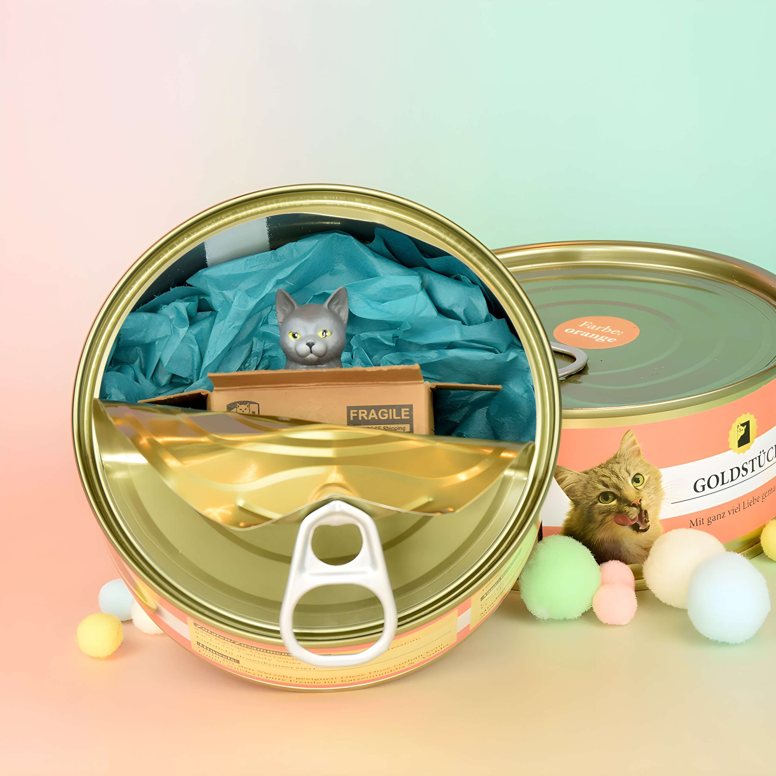 Du kannst wählen zwischen einer Geschenkverpackung in Futterdosen-Form mit Aufreißlasche oder einer kleinen Geschenkbox mit Schleifchen. In beiden Fällen bekommst du eine Mini-Adoptionsurkunde dazu (7,6 x 5,4 cm), auf der du den Adoptanten (Beschenkten) eintragen kannst. 🙂